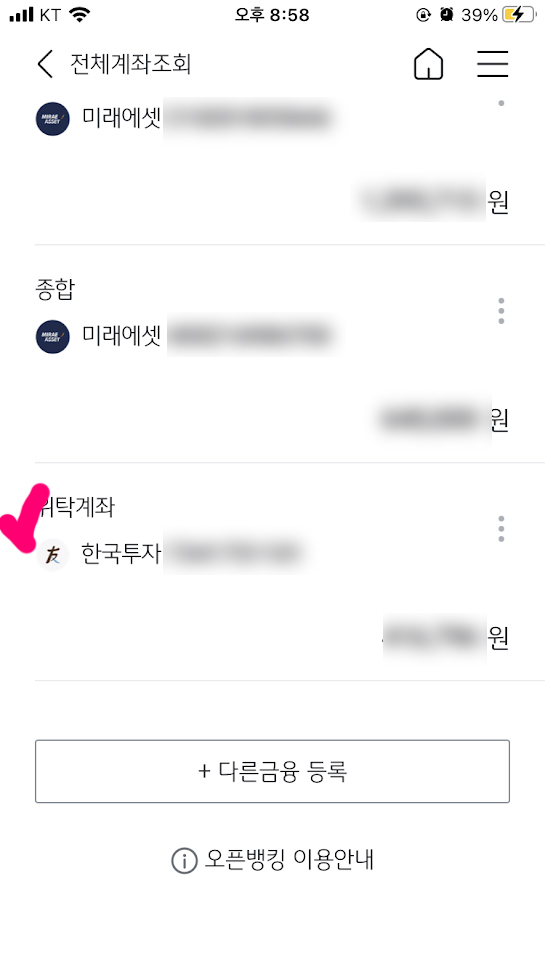 10. 화면을 내려 한국투자증권을 찾아간다. 그리고 한국투자증권 계좌를 누른다.