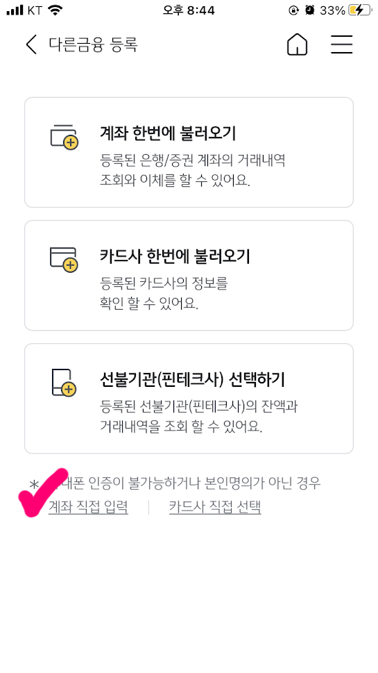 3. 하단 '계좌 직접 입력'을 누른다.