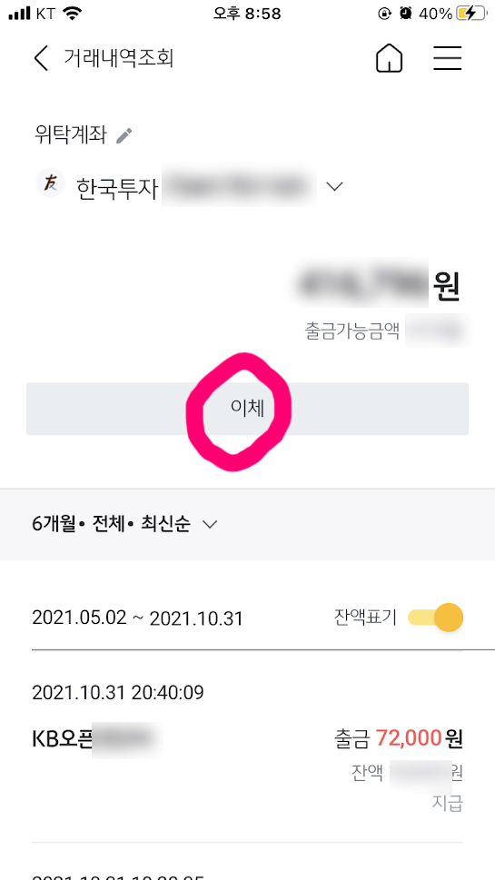 11월 예산을 짜면서, 한국투자증권 계좌에 있는 72,000원을 빼와야 하는 상황이 되었다.
