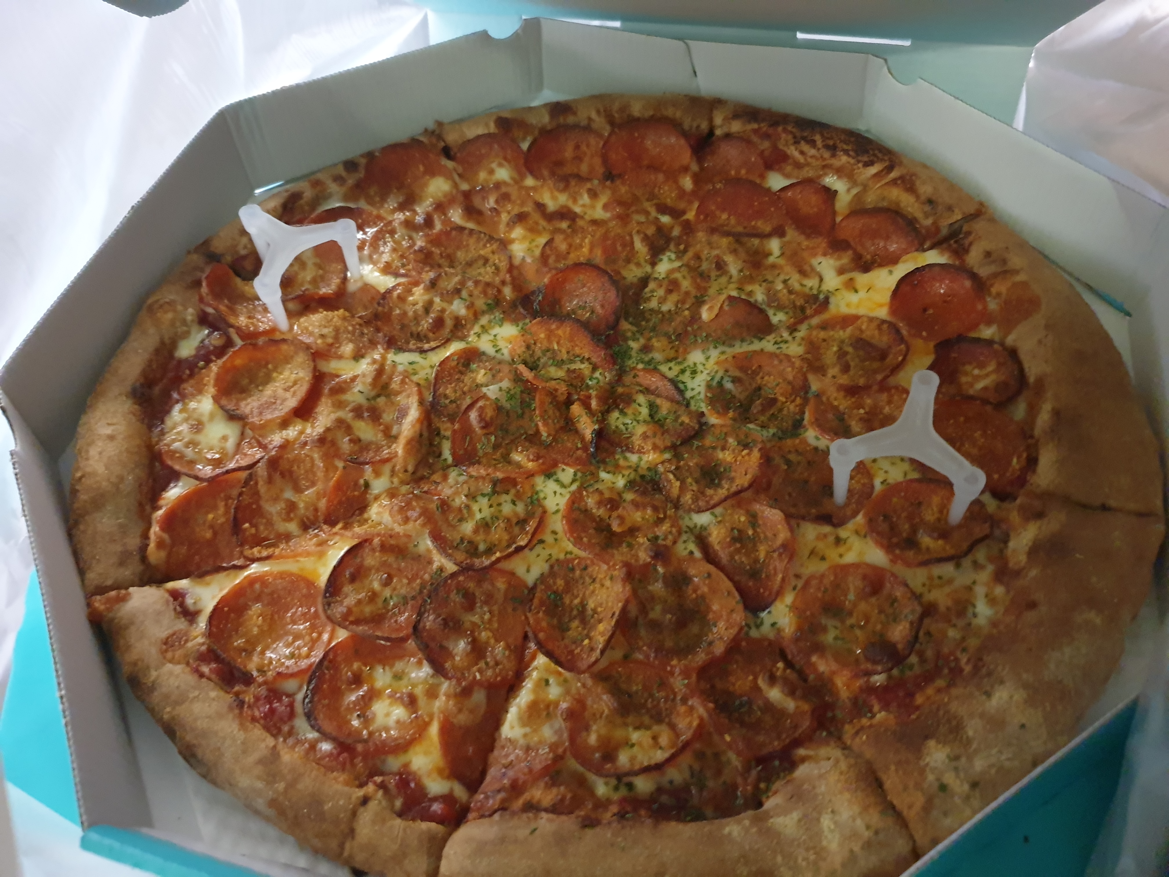 페퍼로니 피자 실물 영접. 진짜 페퍼로니를 아낌 없이 넣어준게 눈에 보였다. 페퍼로니가 막 겹쳐져 있다.