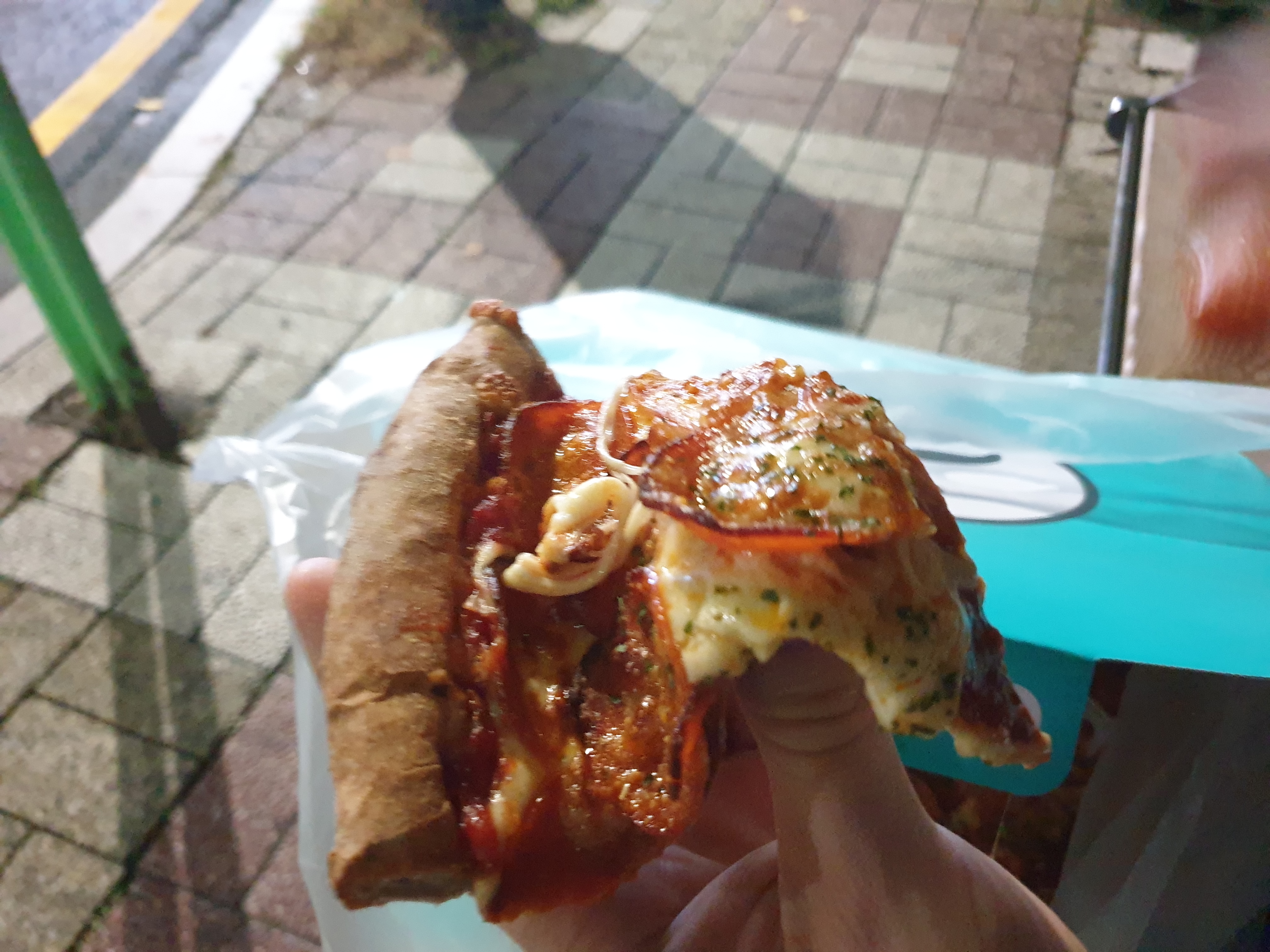 저녁을 부실하게 먹어 배고팠던 우리는 집에 갈때까지 피자 냄새를 견디지 못할 것임을 알았다. 바로 피자 선생 밖에 있는 버스정류장에 앉아 피자박스를 열었다.