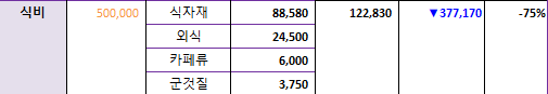 식비 예산 중 아직 75%가 남았다. 이번주에 25%를 쓴 건 바람직하다. 외식보다 식자재 구입이 많았던 것도 칭찬한다.
