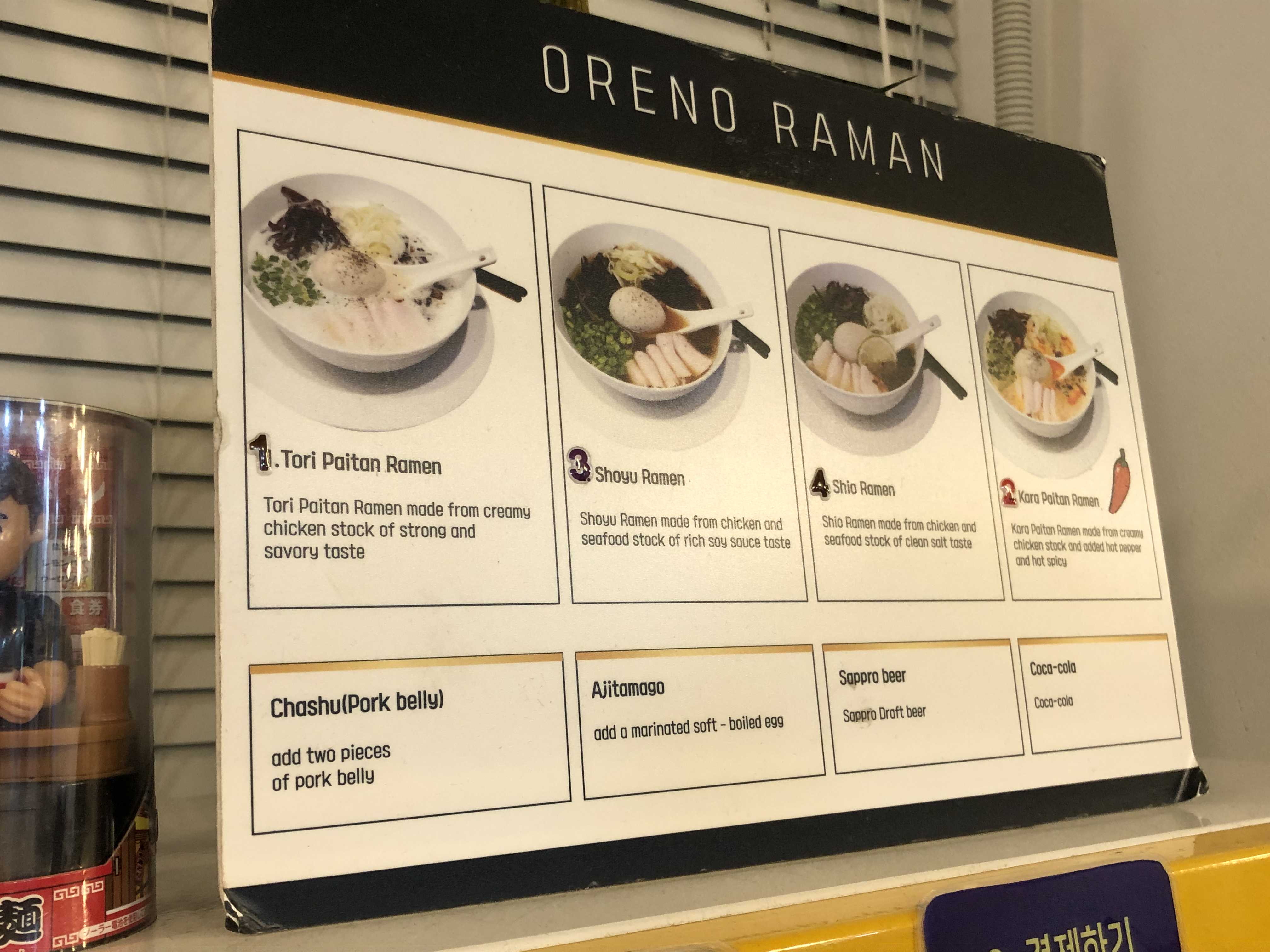 오레노라멘의 모든 라멘은 한 그릇에 9,000원 입니다. 삼겹차슈를 추가하거나 반숙 계란을 추가할 수도 있습니다.