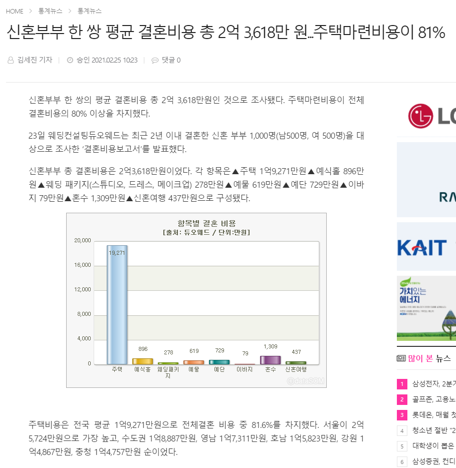 부르는게 값이라는 한국의 살인적인 웨딩산업 물가. 2021년 2월 나온 기사에 따르면, 신혼부부 한 쌍 평균 결혼비용이 총 2억 3,618만 원 이고, 이 중 주택마련 비용이 81%래요.