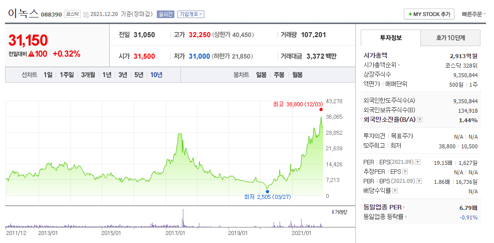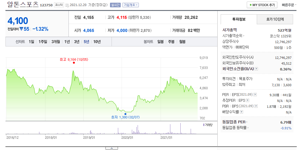 알톤스포츠 대표는 '김신성' 대표 2015년부터 알톤스포츠를 경영하고 있는 듯하다. 김신성 대표에 정보는 인터넷상에 그리 많지 않다. 알톤스포츠의 주인인 이녹스의 부사장이기도 하다. 이녹스가 궁금해져서 찾아봤는데, 이 기업도 2020년에 죽다 살아난 경험을 한 기업이었다. 주가 2,505원까지 떨어졌다가 현재 31,150원.