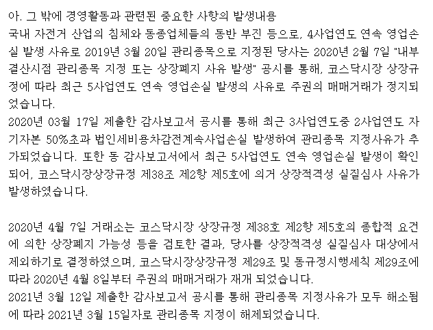 2020년 3월 17일에는, 최근 3사업연도 중 2 사업연도 자기 자본 50% 초과 법인세비용차감전 계속사업 손실이 발생하여 관리종목 지정사유가 무려 하나 더 추가되었다. 그리고 2020년 3월에도 최근 5 사업연도 연속 영업손실이 발생이 확인되어 과연 이런 기업이 상장해도 되는 것인가에 대한 심사를 받게 되었다.