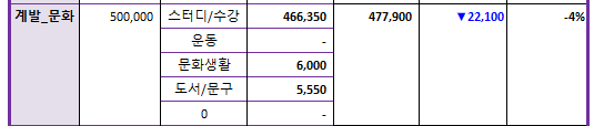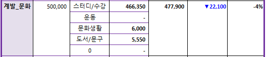남편의 학비 신용카드 할부값이 대부분이다. 문화가 있는 수요일에 영화 '스파이더'을 봤다. 남편의 SKT VIP멤버십을 이용해서 영화티켓 1개를 예매하고, 나머지 티켓 1개는 네이버 포인트와 현금을 이용해서 구매했다. 남편 장학금 신청을 위해 질 좋은 종이를 사서 인쇄하느라 문구비가 들었다.