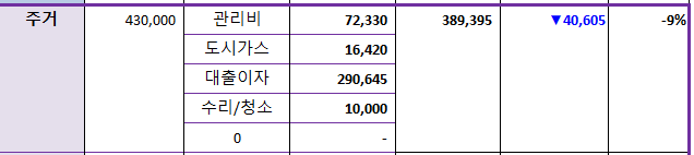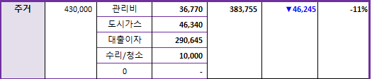 추운 겨울이 되어 도시가스비가 11월에 비해 3만원이나 더 나왔다. 수도요금은 이번달에 청구가 안되어서 관리비에서 조금 지출을 덜 할 수 있었다.