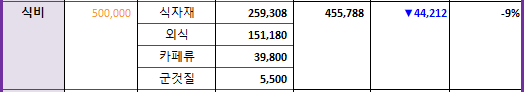 식비는 잡았던 예산 50만원보다 약 4만 4천원을 덜 썼다. 칭찬할만한 것은 외식보다 식자재 구입이 더 많았던 것. 사실 외식은 네이버 블로그 체험단을 통해 6만원 상당의 저녁식사를 한 번 할 수 있었다.