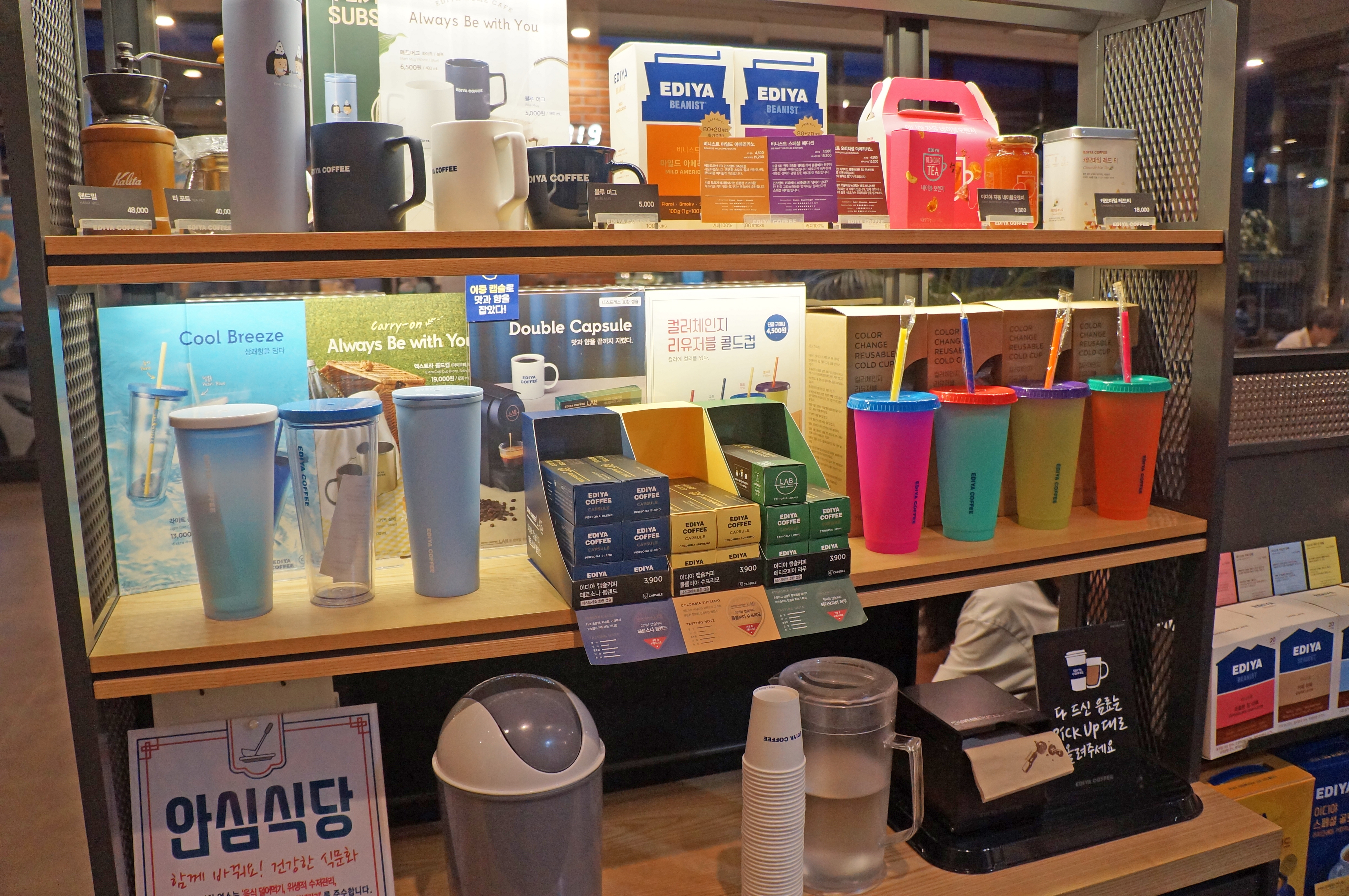 음료를 기다리는 동안 이디야커피 굿즈들을 구경했다. 알록달록 컬러체인지 리유저블 콜드컵이랑, 가성비 좋은 캡슐커피가 눈에 들어왔다. 이쁘당 :)