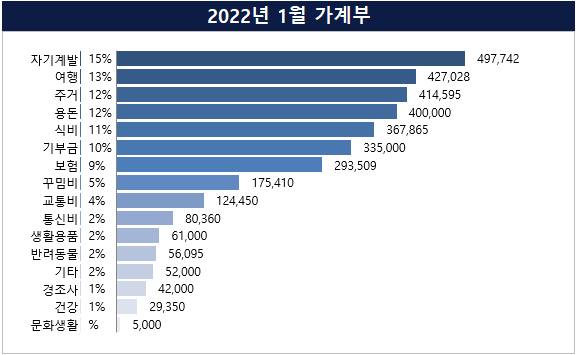 그래서 결국, 1월에는 야심차게 짜게 잡았던 한달 예산 288만원을 훌쩍 넘은 336만원을 지출했다. 47만원이나 빵꾸가 났다. 예비비 통장에 있는 돈을 다 털어서 이정도 빵꾸다. 휴...