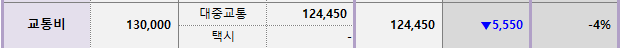 12월에 부산 여행을 다녀와서 대중교통비가 평소보다 더 많이 나왔다. 13만원을 예산으로 잡아 놓았는데 예상보다 살짝 적은 124,450원이 결제되었다.
