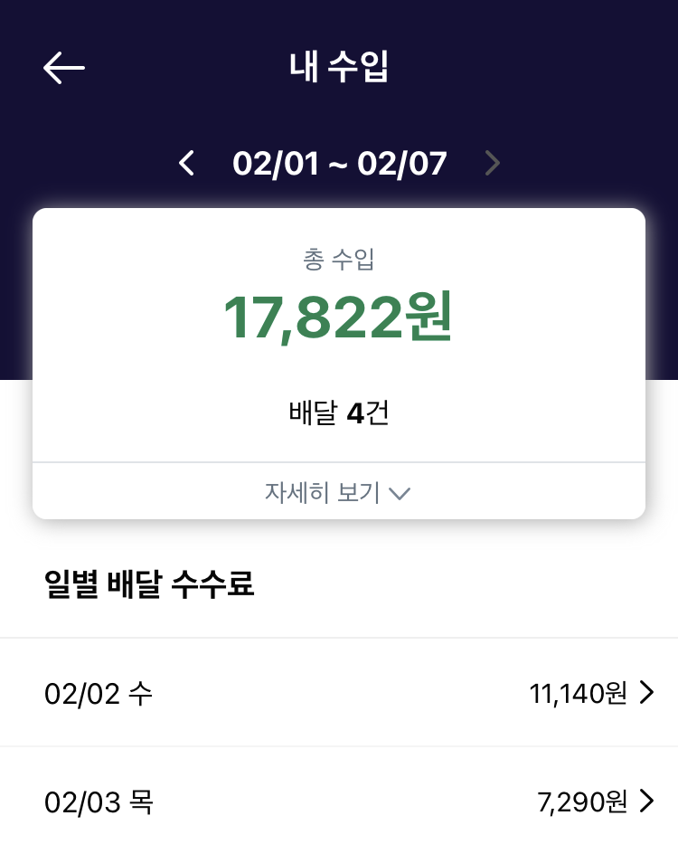 이렇게 이틀 동안 총 4건의 배달을 하고 나서 총 17,822원을 벌었다. 쿠팡이츠를 도보로 배달하는 일 자체는 그리 오랜 시간이 걸리지도 않고 힘들지도 않지만, 배달이 언제 잡힐지 모르고 기다리는 시간까지 포함하면 최저 시급도 안 나오는 수가 있다. 도보 배달은 절대로 '돈'을 목적으로 해서는 안되고 '가볍게 운동삼아' 한다면 지속할만한 것 같다. 한 달에 단 1만 원의 부수입도 감사한 현재의 나는 앞으로도 계속해서 할 의향이 있다.