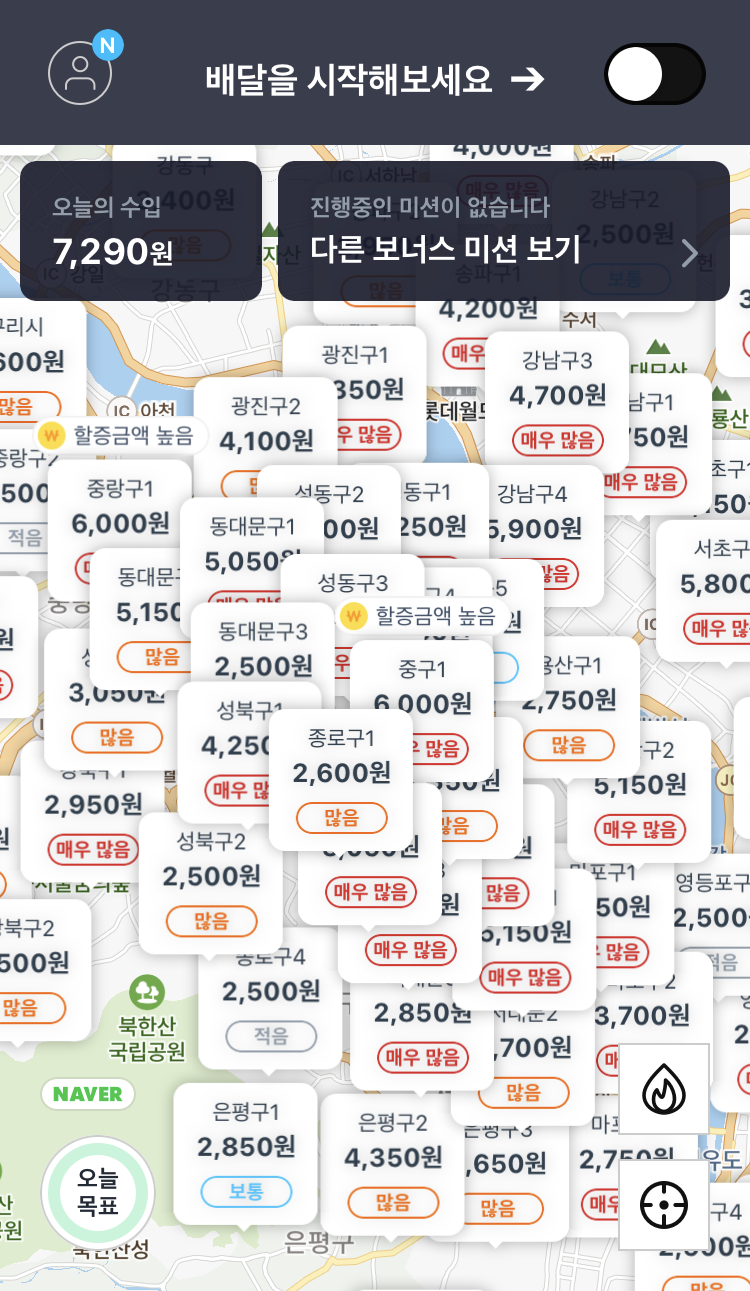 쿠팡 이츠를 시작하기 전 내가 긴장했던 부분은 바로 이것. "스위치를 켜자마자 갑자기 배달이 잡히면 어쩌지?" 괜스레 긴장되었다. 하지만 그건 설레발이었다. 스위치를 켠다고 해서 갑자기 배달이 잡히진 않는다. 배달이 계속 안 잡히길래 식당이 많은 쪽으로 걸어서 이동했는데도 배달이 잡히지 않았다. 그래서 좀 더 식당과 카페가 많은 옆동네로 따릉이를 타고 이동해서야 최초 배달이 잡혔다. 도보 배달은 건수가 그리 많지 않다고 들었는데 사실인가 보다.
