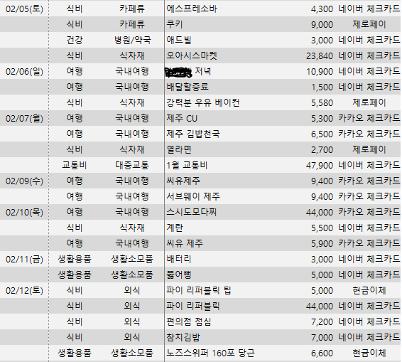 - 지난 주 가계부 리뷰 때 2/5일자를 포함시키지 않아서 이번 리뷰에서 포함 시킨다.