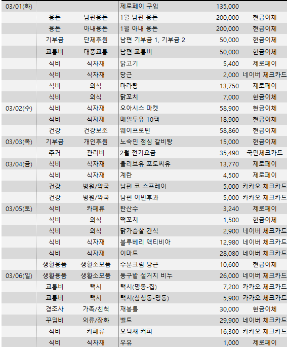 3월 첫째주에 지출을 많이 하긴 했으나 대부분이 식비 지출이었다. 남편에게 현재 상황을 공유하고 3월 둘째주를 최대한 식비 지출을 줄여 살아 보기로 했다.