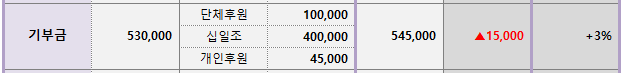 장학금 등 수입이 좀 더 늘어나면서 십일조의 비중도 늘어났다. 이번 달 기부금으로 책정한 예산은 53만원인데 예정에 없던 기부금이 지출되었다. 남편이 길을 걷던 중 한 할머니 노숙자가 너무 배가 고프다고 남편에게 호소를 해서, 현금을 주는 대신 근처에 있는 갈비탕 집에서 밥을 사줬다고 했다. 우리도 평소에 안 사 먹는 갈비탕이라서 갈비탕이 15,000원이나 하는 줄 몰랐다며 솔직히 깜짝 놀랐다고 했다. 하지만 누군가를 도울 수 있어서 기뻤다는 황금마음밭 남편, 못 말린다 정말 ~ ㅎㅎ