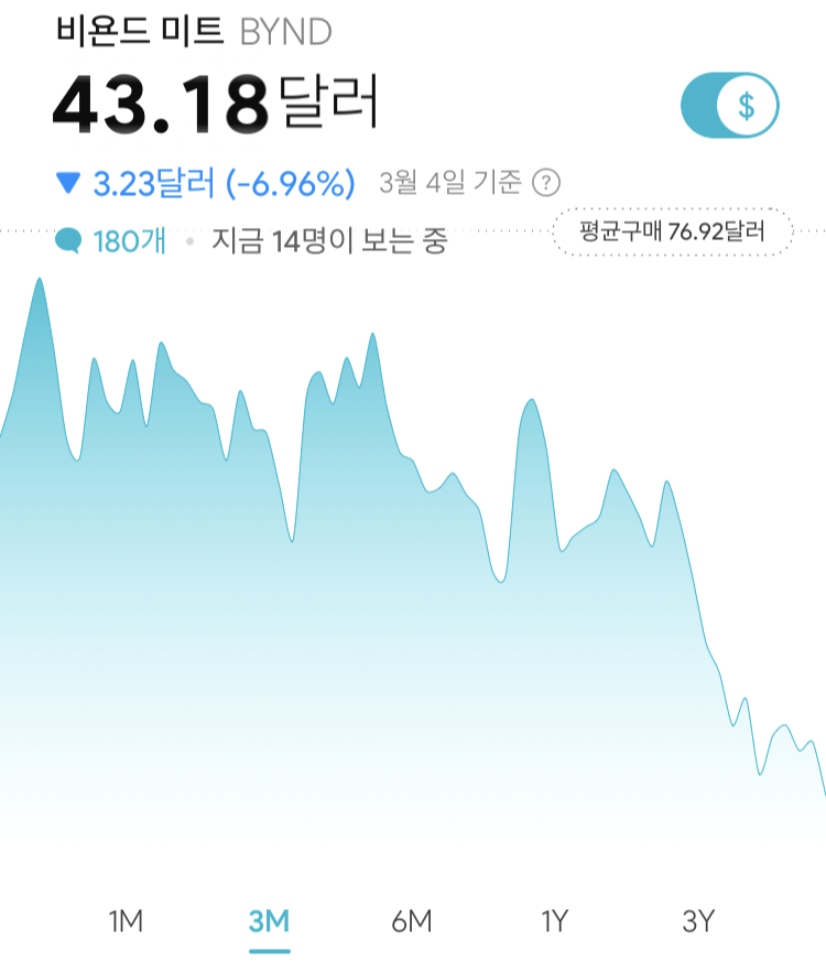 앞으로 확대될 비건 시장, 기후위기를 의식한 사람들의 육류 소비 감소를 생각하며 비욘드 미트 미국 주식을 샀다. 제대로 공부하고 산 건 아니고, 그냥 "오 이런 기업이 있구나, 앞으로 성장할 것 같은데?" 하는 막연히 응원하는 마음에 주식을 산거다.