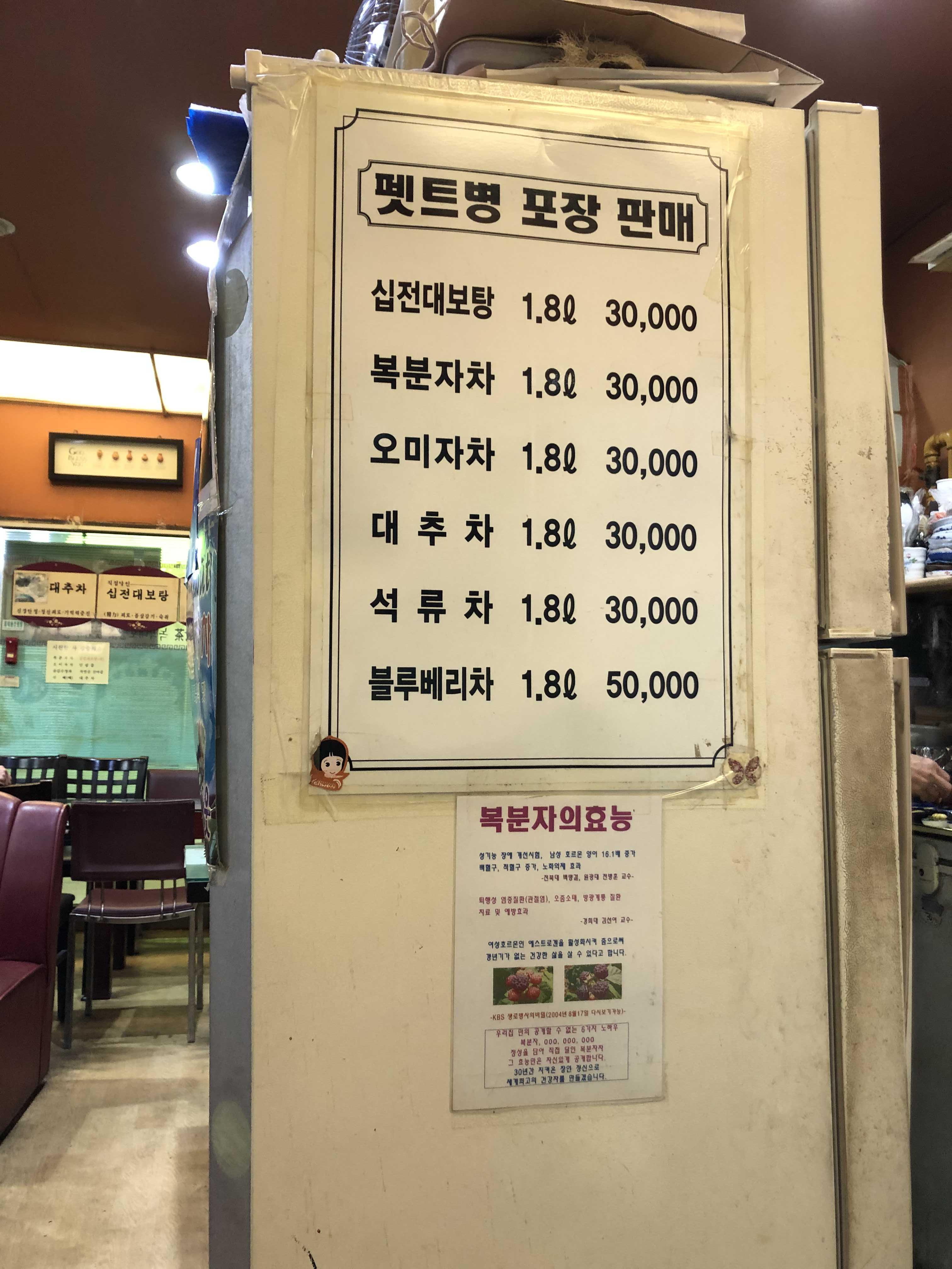 이곳 전통 찻집의 메뉴는 간단합니다. 십전대보탕이 시그니처 메뉴이고, 그 외에 달달한 차들도 준비되어 있습니다. 제가 가장 자주 마시는건 복분자차, 아니면 대추차입니다.
