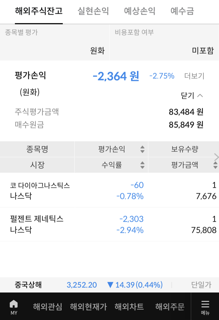 5개 예약주문을 걸어놓고 자고 일어나 아침에 삼성증권 앱에 접속해보았다. 5개 중 2개가 주문체결되어 있었다. 나머지 3개는 내가 기대하는 가격대까지 떨어지지 않아서 체결이 되지 않았다.