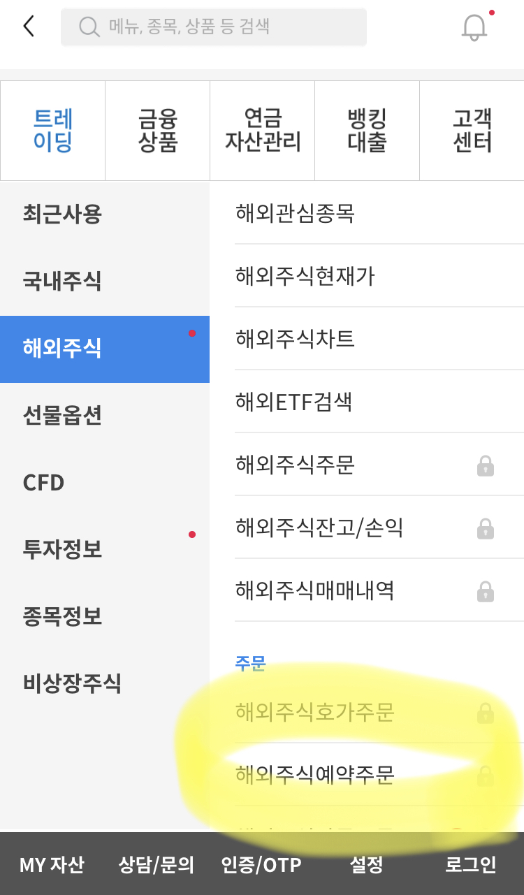 해외주식 예약주문을 위해서는 일단 앱을 켜고 오른쪽 하단의 三 버튼을 눌러 메뉴로 들어간다. 그 다음 ‘해외주식’ 탭을 클릭한다. 그러면 오른편에 ‘해외주식예약주문’ 메뉴가 뜬다.