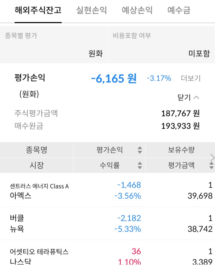 지금까지 매수에 쓴 돈은 159.61달러. 1차로 환전한 돈은 다 썼다. 다음주에 영업일이 되면 나머지 27만원도 환전해서 아직 매수 못한 주식들을 매수하려고 한다. 이렇게 9주를 구매한 결과 벌써 파란 바다가 눈 앞에 펼쳐진다. 하지만 어차피 1년 동안 가지고 있어야 하므로 아직 슬퍼할 일은 아니다.