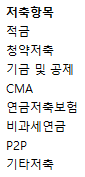 - 양식 내 제시되어 있는 저축 항목은 적금, 청약저축, 기금 및 공제, CMA, 연금저축보험, 비과세 연금, P2P, 기타 저축이 있습니다. (저축에도 이리 다양한 방법들이 있다는 것을 새로 배웠습니다.)