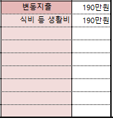 식비, 생활비, 쇼핑비 등 한 달 동안 매번 바뀔 수도 있는 지출을 적어줍니다. 평소 가계부를 쓰지 않는 사람이라면 변동지출을 적는 게 어렵다고 느껴질 수도 있습니다. 저는 지난 1,2,3월의 가계부를 보니 변동지출의 평균 금액이 190만 원이라서 190만 원으로 적었습니다.
