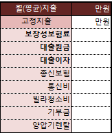 저의 경우 '보장성 보험료, 대출원금, 대출이자, 종신보험, 통신비(인터넷+핸드폰), 빌라 청소비, 기부금, 양압기 렌털' 이 매월 고정적으로 빠져나갑니다.