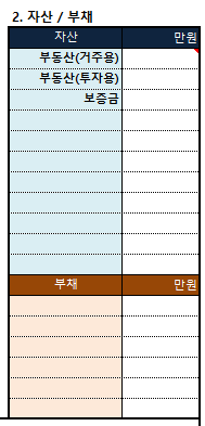 가지고 있는 자산이 있다면 적어주세요. 부동산 자산을 적을 때는 '공시지가'가 아닌 요즘의 실거래가로 적어줍니다. 집 보증금 때문에 대출을 받은 것이 있다면 부채에 적어 넣습니다. 저는 신용대출과 주택담보대출, 남편의 학자금 대출 이렇게 두 개가 있어서 적어 넣었습니다.