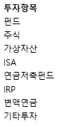 - 양식 내 제시되어 있는 투자항목은 펀드, 주식, 가상자산, ISA, 연금저축펀드, IRP, 변액연금, 기타 투자가 있습니다.