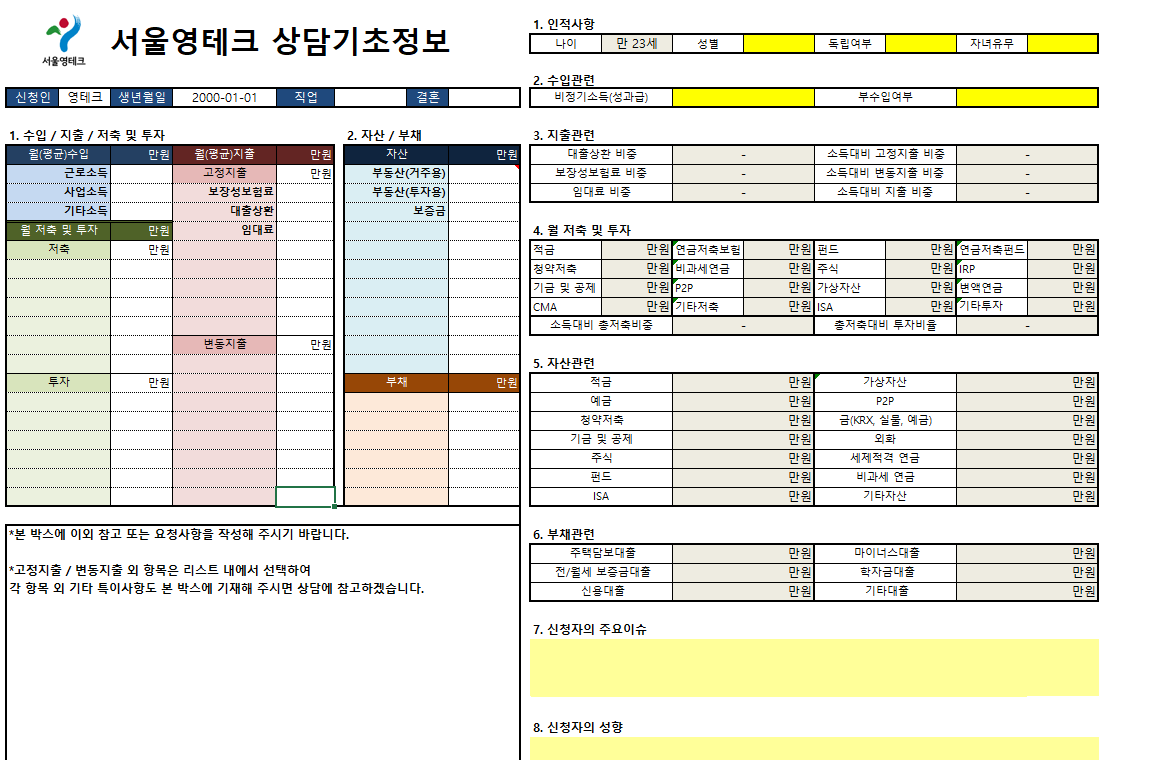 그럼 영테크 상담 양식에는 어떤 내용을 채워 넣어야 하는지 알려드리겠습니다.