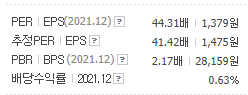 과거 PER이 가장 높았던 때를 기준으로 따졌을 때 현재 주가가 무지막지하게 높은 것은 아니지만 높은 편에 속하는 것 같다. 왜냐하면 주로 20대의 PER을 유지한 해가 많았기 때문이다. 2018년에 45.46, 2019년에 79.05, 그리고 작년에 44.30 이였던 때를 제외하고는 거의 PER이 14.42~27.24 사이를 유지했다.