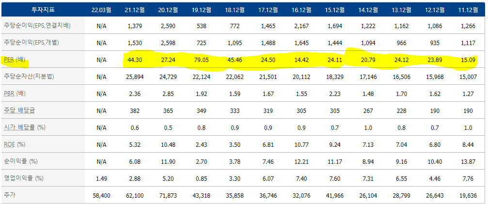 이를 실전으로 옮겨보자. 유한양행의 주가 수익비율은 44.31이다. 지난 10년 동안 유한양행의 PER은 14.42~79.05 였다.