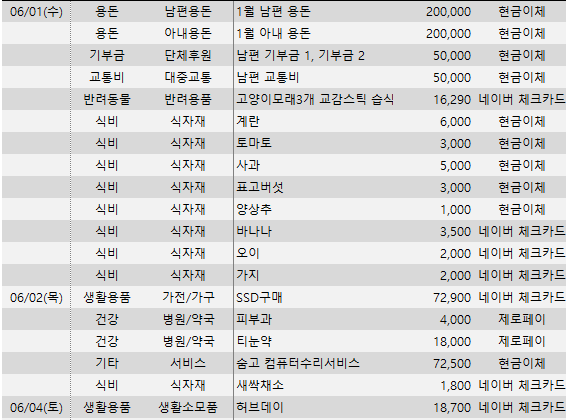 6월의 첫 주가 금방 지나갔다. 지난달에 식료품을 많이 사놓은 탓인지 생각보다 6월 초에 미친 듯이 지출을 하진 않았다. 6월 첫째 주, 4일 동안 어떻게 살았나 한 번 보자.