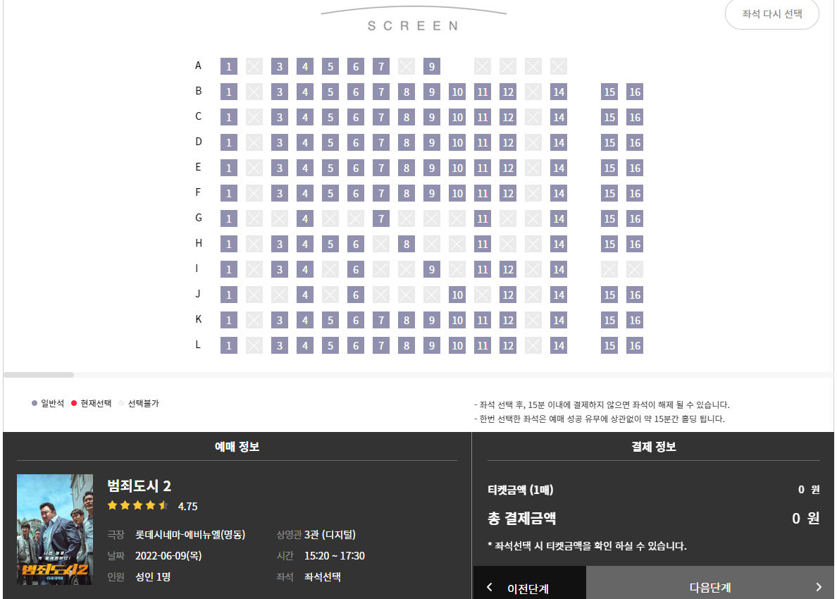 4. 영화, 영화관, 관람일, 시간을 선택하고 다음단계 클릭