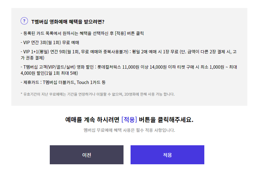 7. T멤버십 영화 혜택 사용 고르고 하단 적용 버튼 클릭