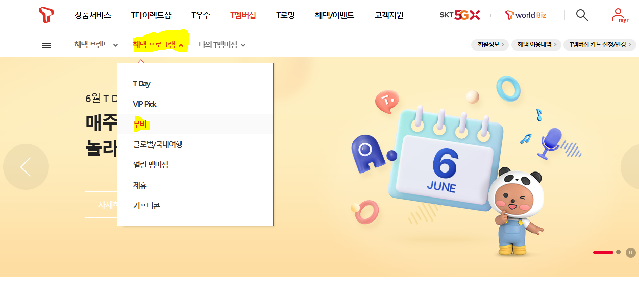 가계 지출 감소를 위해 알뜰폰으로 갈아타고 싶었으나 외국인인 탓에 그 과정이 굉장히 복잡한 부분이 있어서 그냥 포기했다. 대신 SKT 멤버십 VIP 혜택을 놓치지 않고 간간히 누리기로 했다. 그 중 가장 빈번하게 사용하는 SKT T멤버십 VIP 혜택, 롯데시네마 공짜영화 예매하는 방법을 이야기 해보겠다. T멤버십 앱으로는 예매가 안되는 것으로 알고 있고, 컴퓨터로 SKT T멤버십 홈페이지에 들어가면 예매를 할 수 있다.