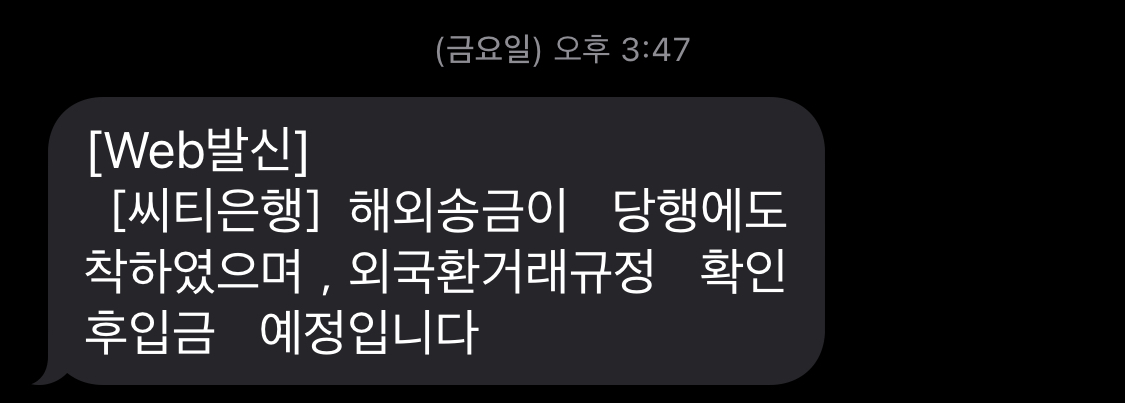 나는 구글 애드센스 수익금이 시티은행의 외화 계좌로 신청을 해 놓았다. 달러 그대로 받고 싶어서였다. 7월 22일 금요일, 구글 애드센스에서 이메일을 받은 다음 날 피싱 문자 같아 보이는 안내 문자가 시티은행에서 왔다.