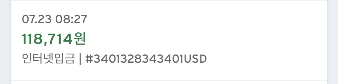 그나마 원달러 환율이 높아서 불행 중 다행인 것인가. 91달러를 원화로 환전해서 이번 달의 수입으로 잡기 위해 환전하니 118,714원이 되었다.