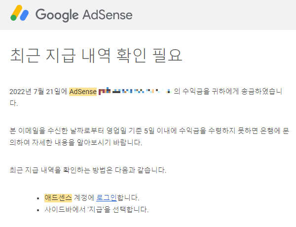 7월 21일 목요일, 구글 애드센스로부터 아래와 같은 이메일을 받았다.