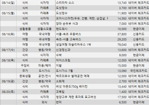 무지출은 없고, 거의 대부분이 식비 지출이었던 8월 셋째 주 지출 톺아보기 시작.