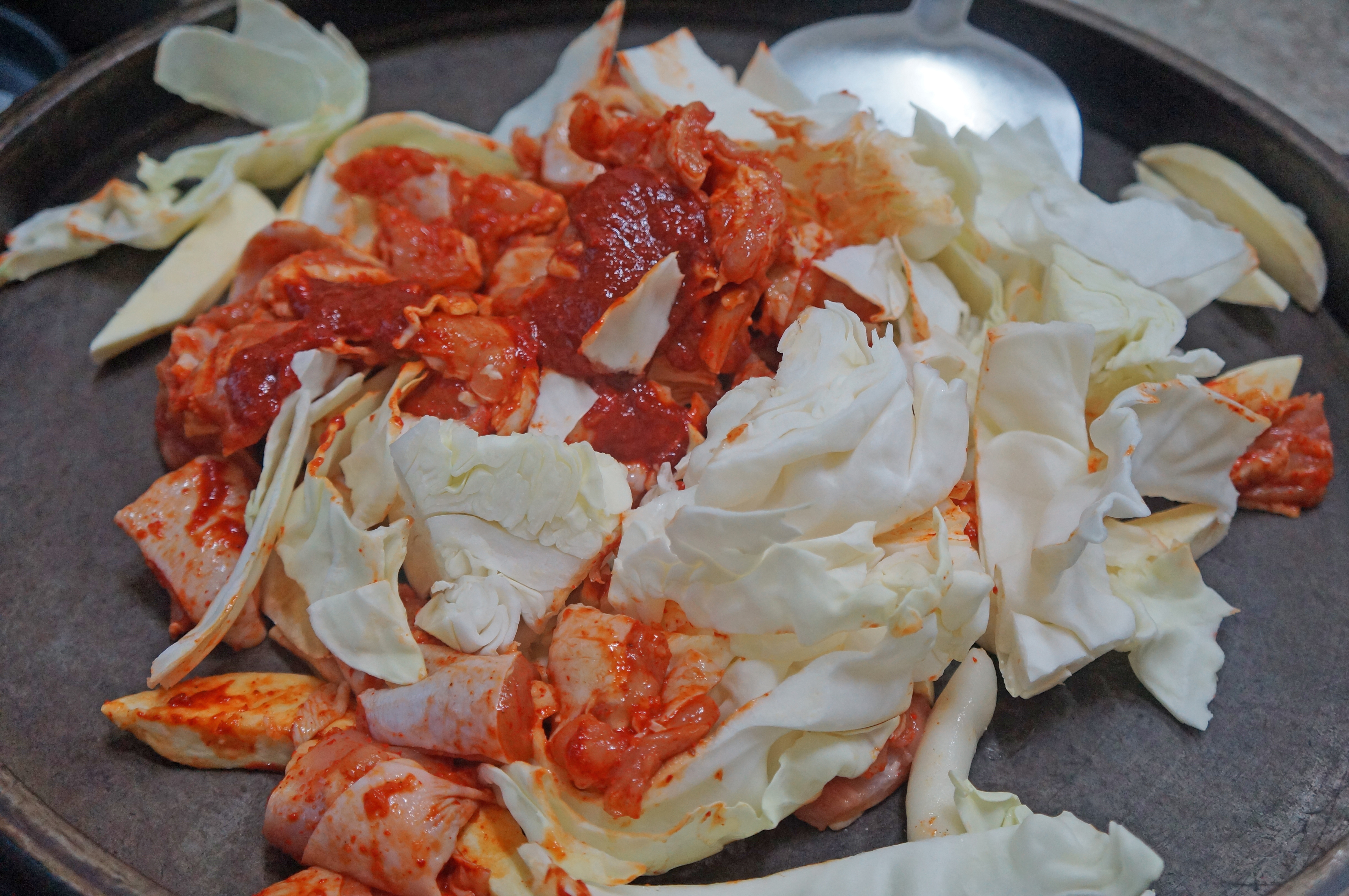 근데 춘천 우성닭갈비에서는 양배추, 고구마, 떡, 닭갈비, 소스를 먼저 철판에 볶는다.