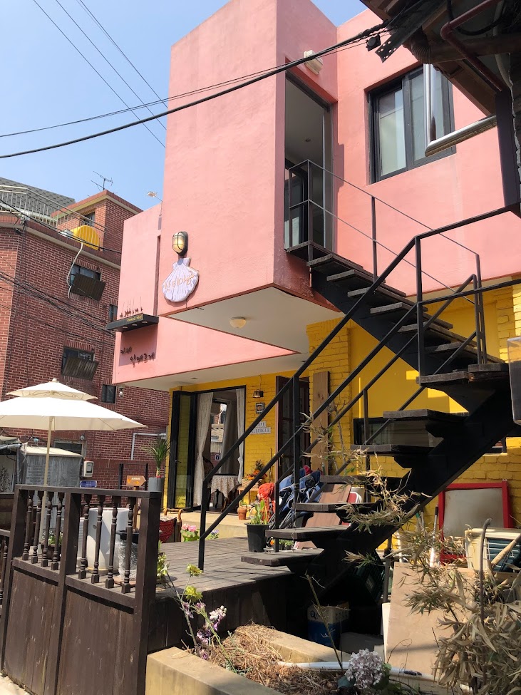 1층은 노란색 페인트로 예쁘게 치해져 있고, 2층은 분홍색 페인트로 외벽이 칠 되어 있다. 마치 스페인에서 본 적이 있을 법한 외부 인테리어다.