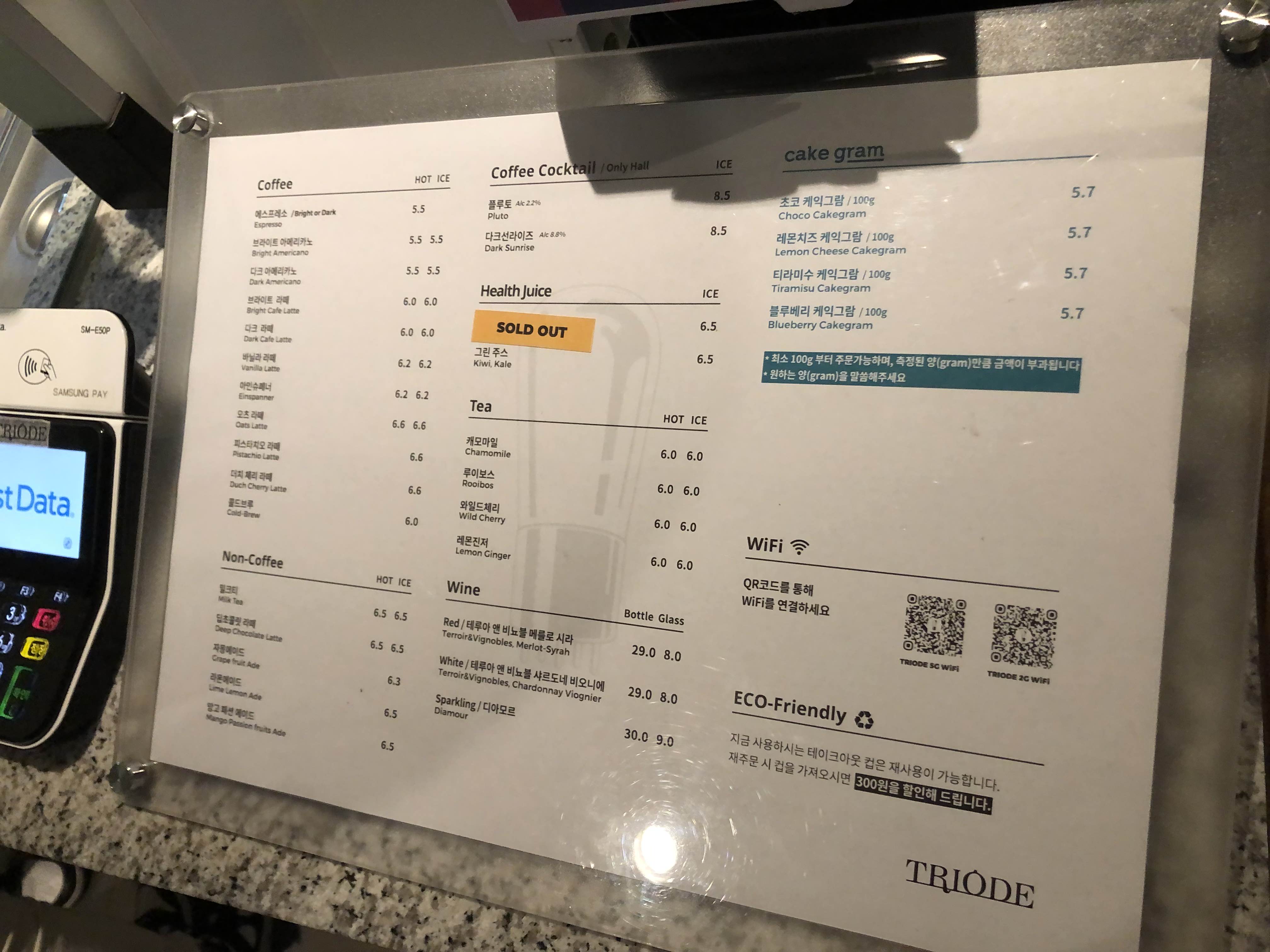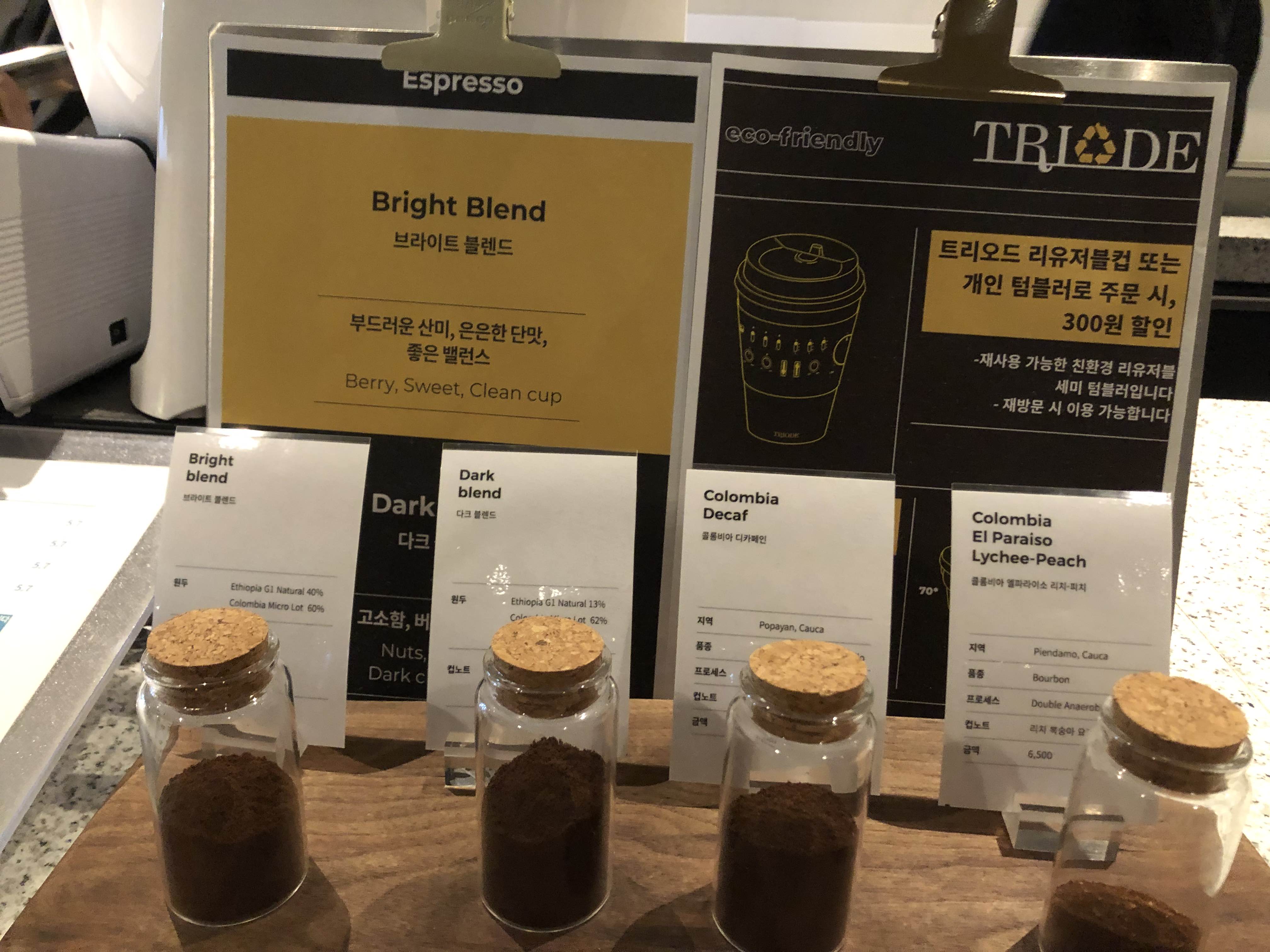 트리오드에서 판매하는 음료류는 커피, 논커피, 커피칵테일, 티, 와인이 있다. 커피 원두 종류를 선택할 수 있어서 좋다. 디카페인 옵션도 있어서 밤에 가기에도 부담스럽지 않다.