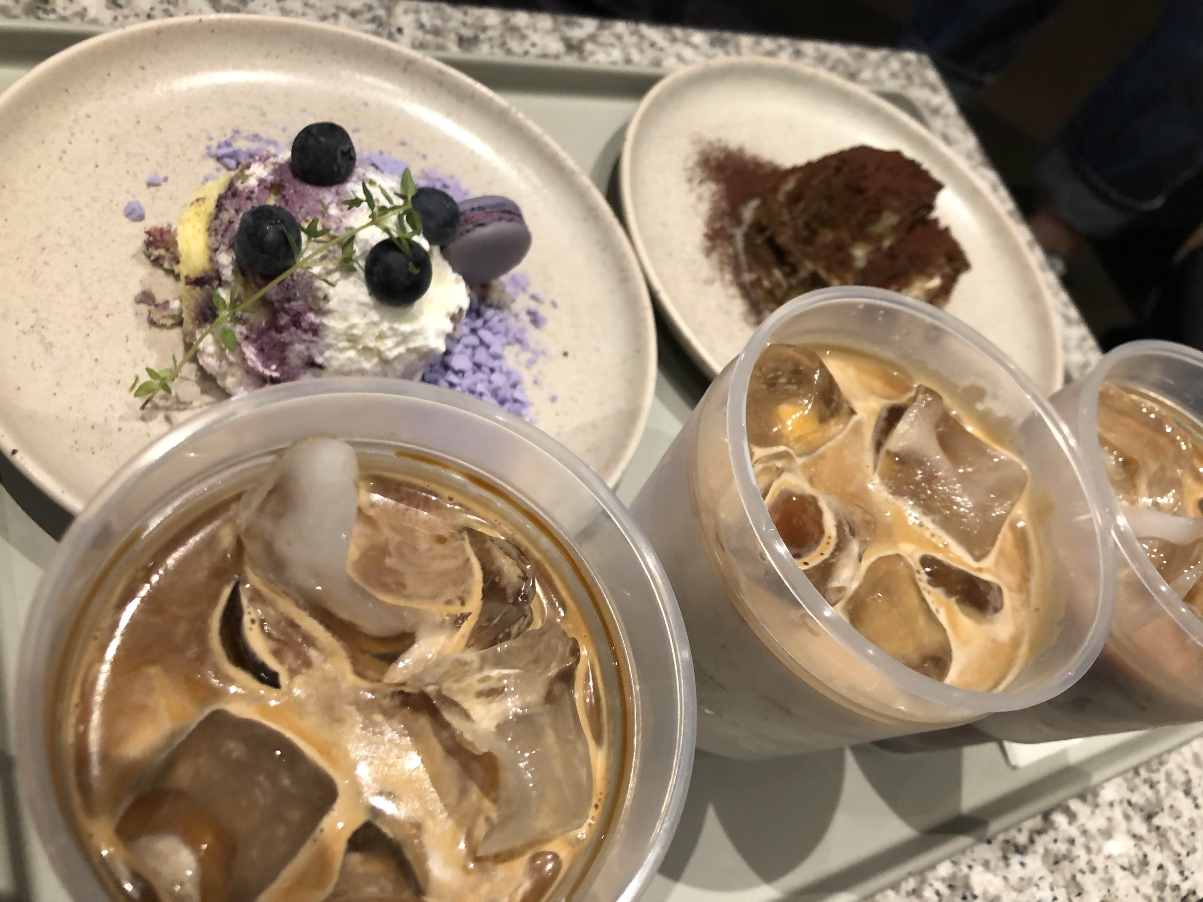 우리가 주문한 메뉴가 나왔다. 세 명이서 가서 라떼 한잔씩과 그램 케이크 100g씩 2개를 주문했다. 티라미수케익그람과 블루베리 케익그람을 주문했다.