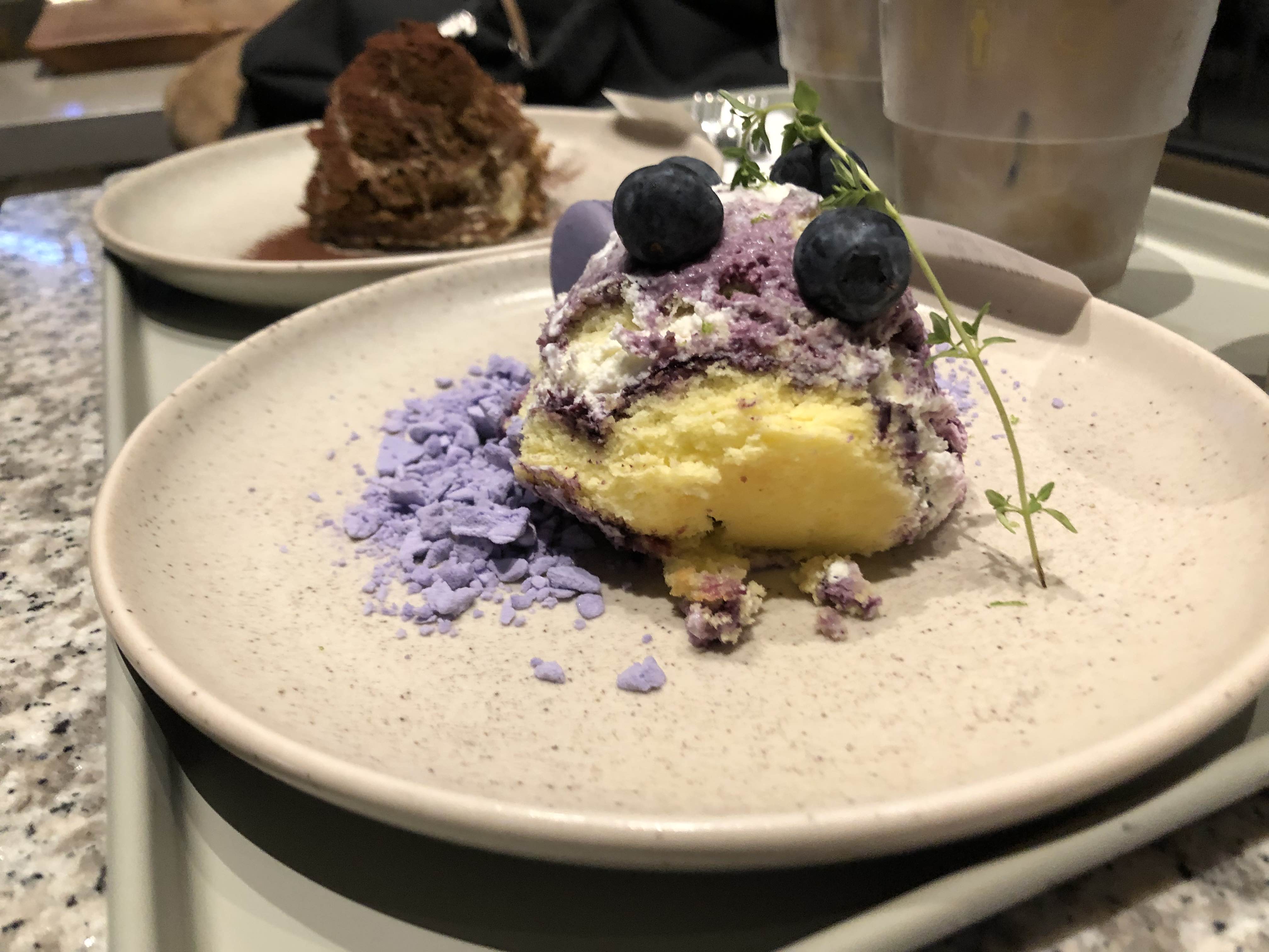 블루베리 케익그람에는 진짜 블루베리 생과를 4개 올려주었다. 보라색 마카롱도 너무나 예쁘고, 데코레이션으로 옆에 뿌려주는 연보라... 마카롱 가루(?) 같은 것도 색깔이 넘나 예쁘다. 맛보다는 보는 재미가 있었던 블루베리 케이크다.