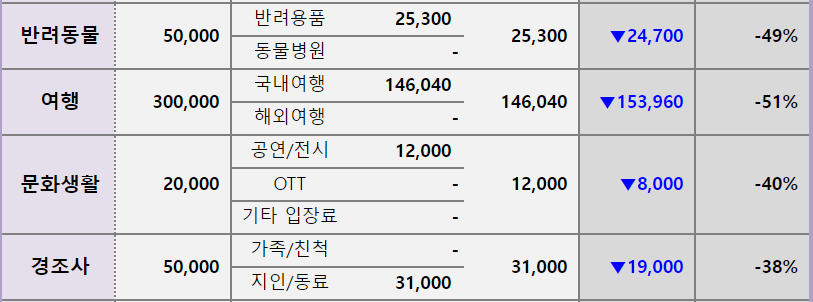이러한 초과지출을 조금이나마 커버해 준 세목은 참 많았다. 그 중 가장 큰 역할을 한 것은 폭우로 취소된 '국내여행' 예산이었다. 꼭 필요한 곳에만 절제하며 돈을 쓴 것 같아서 괜히 뿌듯하다.
