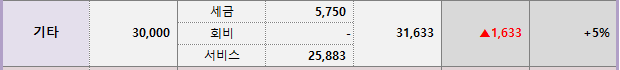 8월은 주민세를 내는 날이라서 세금을 냈고, 부모님 집에 잠자고 있던 캠코더 영상을 디지털화하는 서비스를 이용했다. 오랜만에 가족이 다같이 웃을 수 있었기에 의미가 있는 지출이었다. 하지만 예정했던 30,000원 보다는 1,633원 초과지출을 했다.