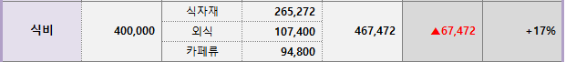 지난 달과 비슷한 수준으로 식비 지출을 했다. 40만 원 선에서 맞추면 좋겠는데, 식비 조절이 참으로 어렵다. 지난 세 달간의 식비 평균인 40만원을 식비 지출 목표로 잡았으나, 호기롭게 67,472원을 초과했다. 어떻게 하면 7만 원을 덜 쓰면서도 배부르게 먹고 살 수 있었을까?